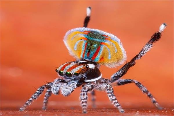 ويتميز «العنكبوت الطاووس» بألوان زاهية وخلابة، تجعله يحمل لقب الأجمل بين فصائل العناكب، حيث يشبه الطاووس في جماله، فعند رؤيته تعر وكأنك أمام لوحة فنية لا مثيل لها.